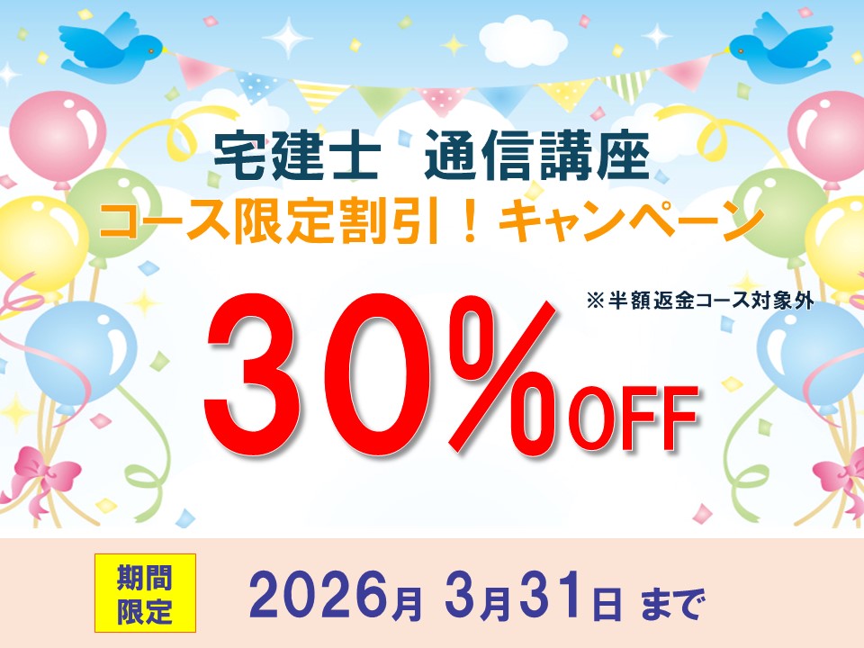 【2026年度】宅建士通信講座がタイムセール30%OFF!お得なキャンペーンは2026/3/31まで実施中!!※商品の発送は3月下旬以降を予定しております※